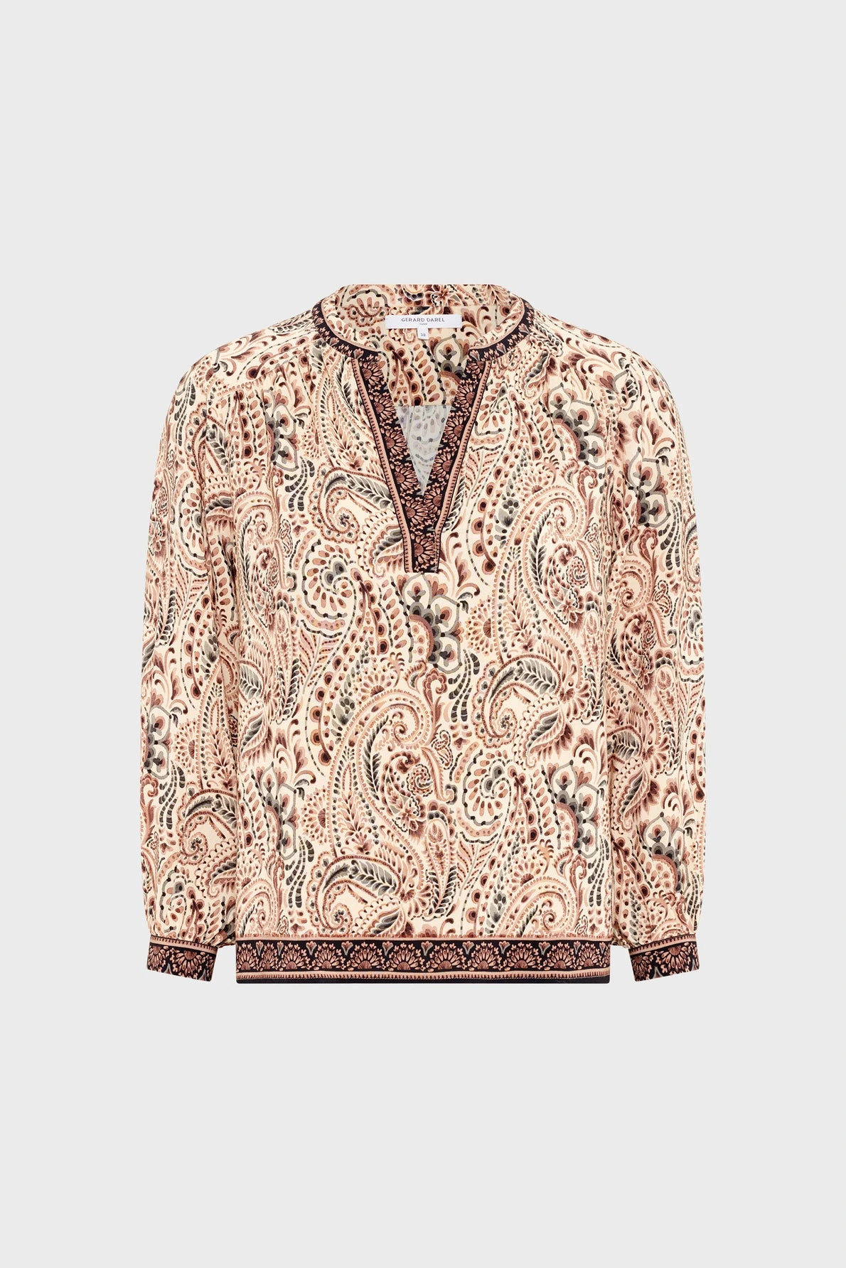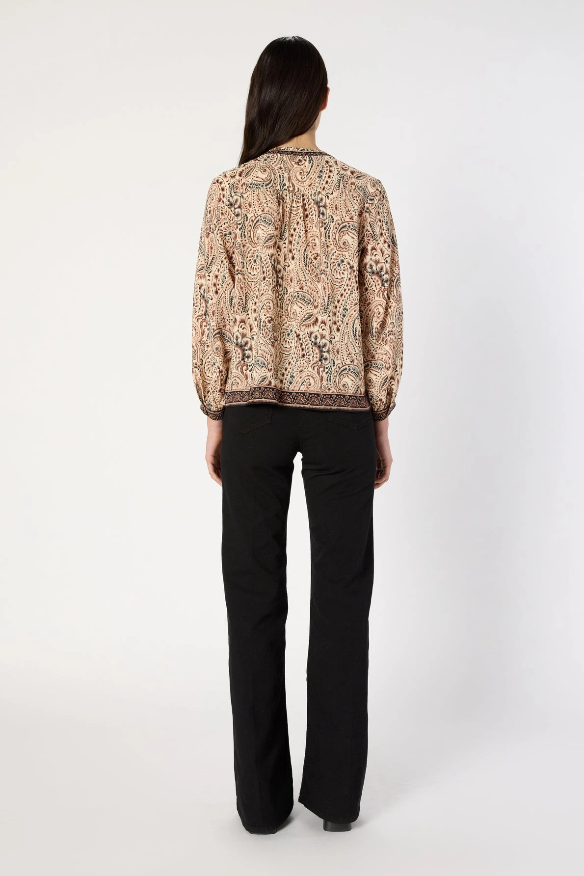 Blouse fluide ornée d’un imprimé végétal beige et marron dans un esprit indien.