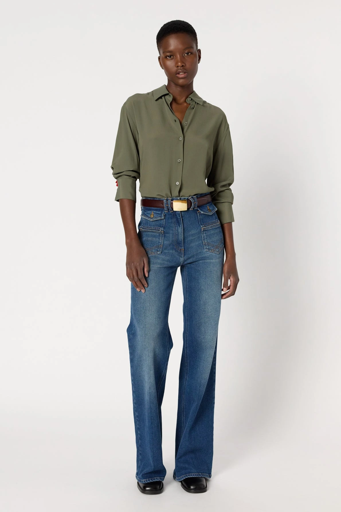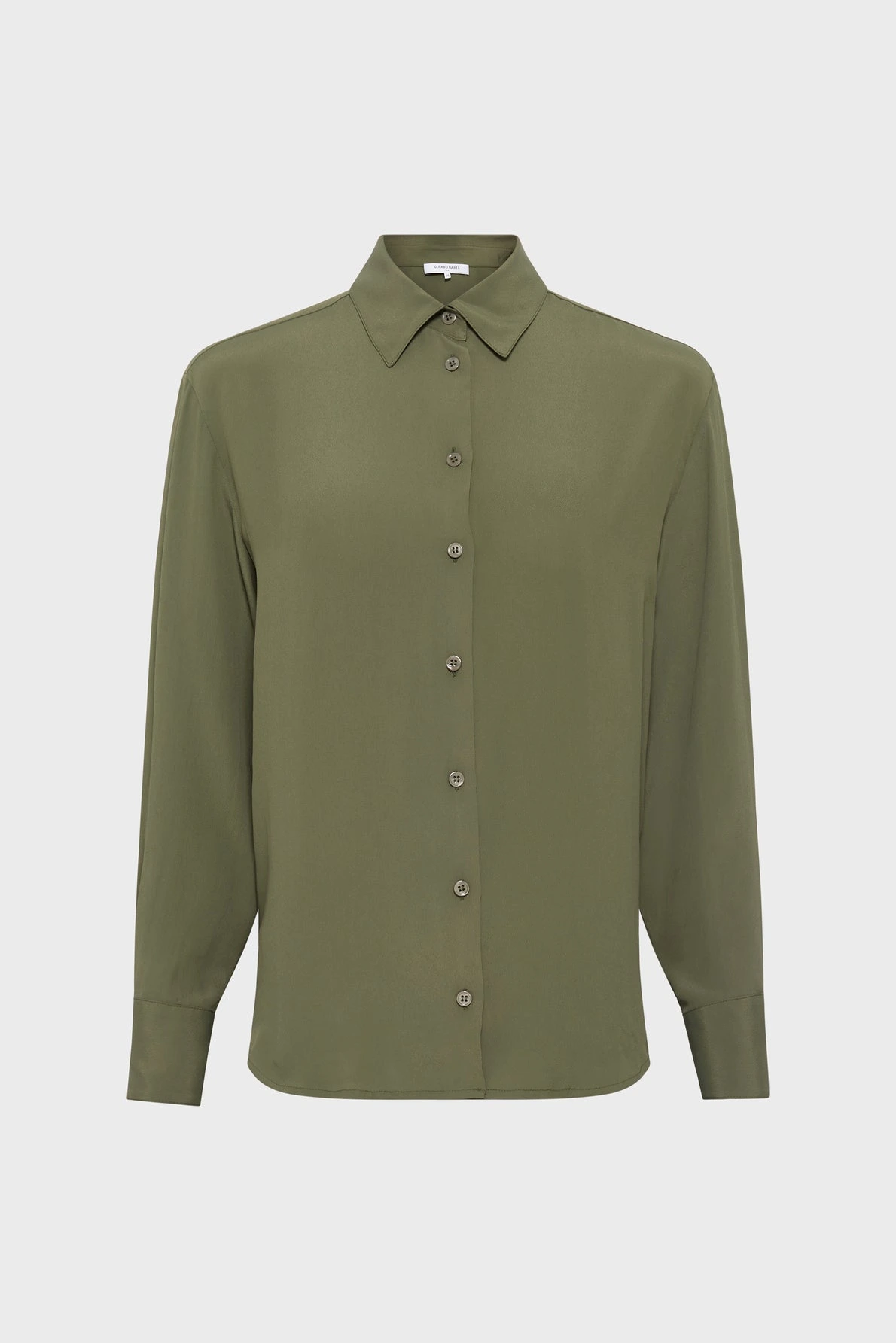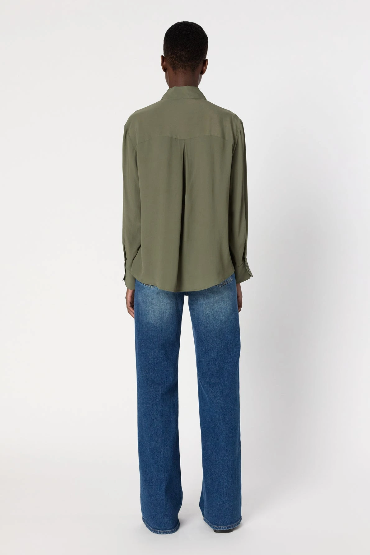 Déclinée en kaki, coloris à la fois chic et tendance, la chemise fluide Agathe se portera en toutes occasions, que ce soit sophistiquée avec un tailleur, casual avec un jean ou rock avec un pantalon en cuir. Confectionnée dans un mélange contenant de la soie.