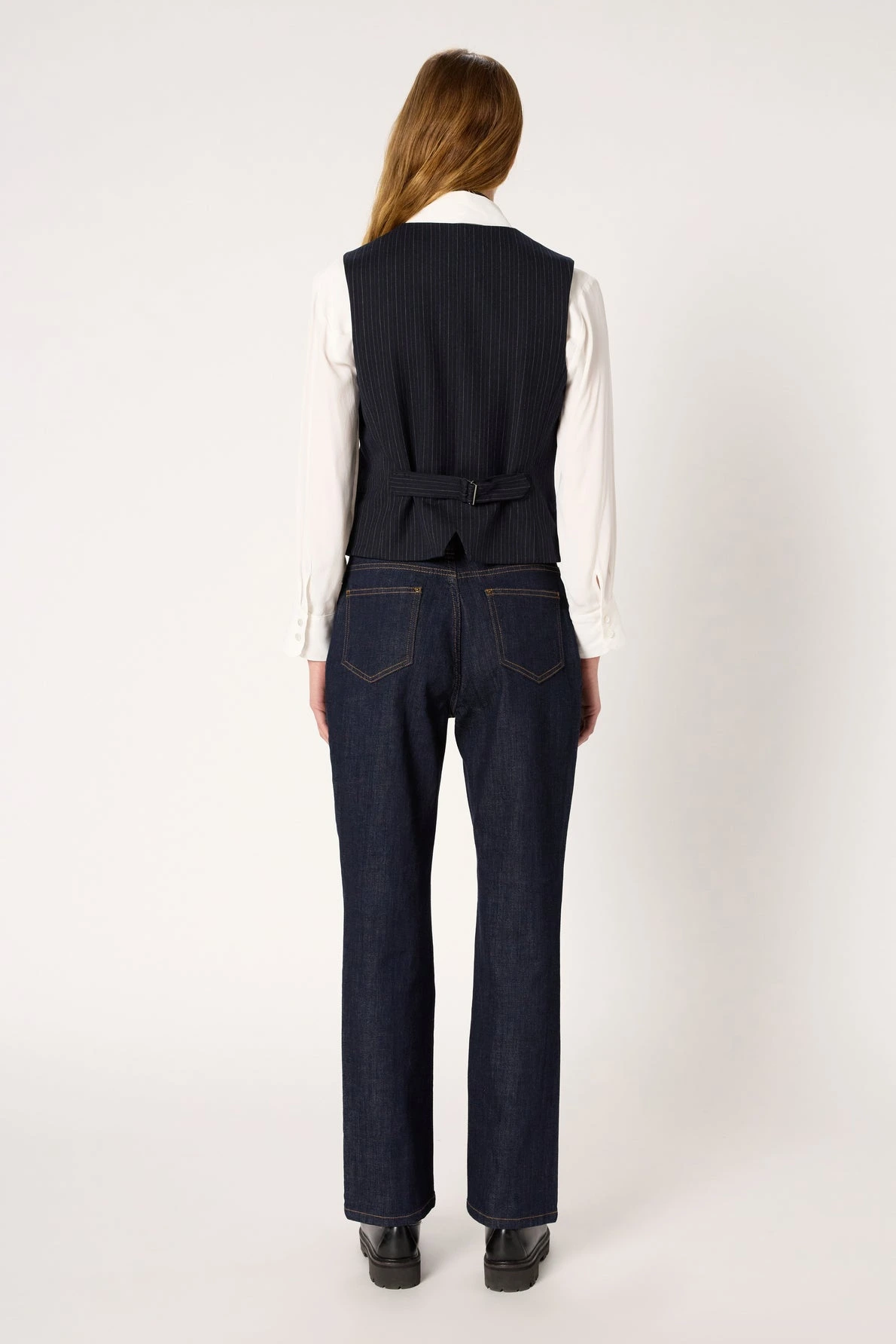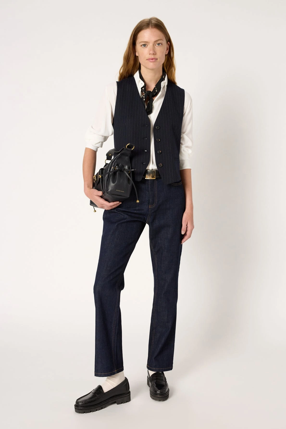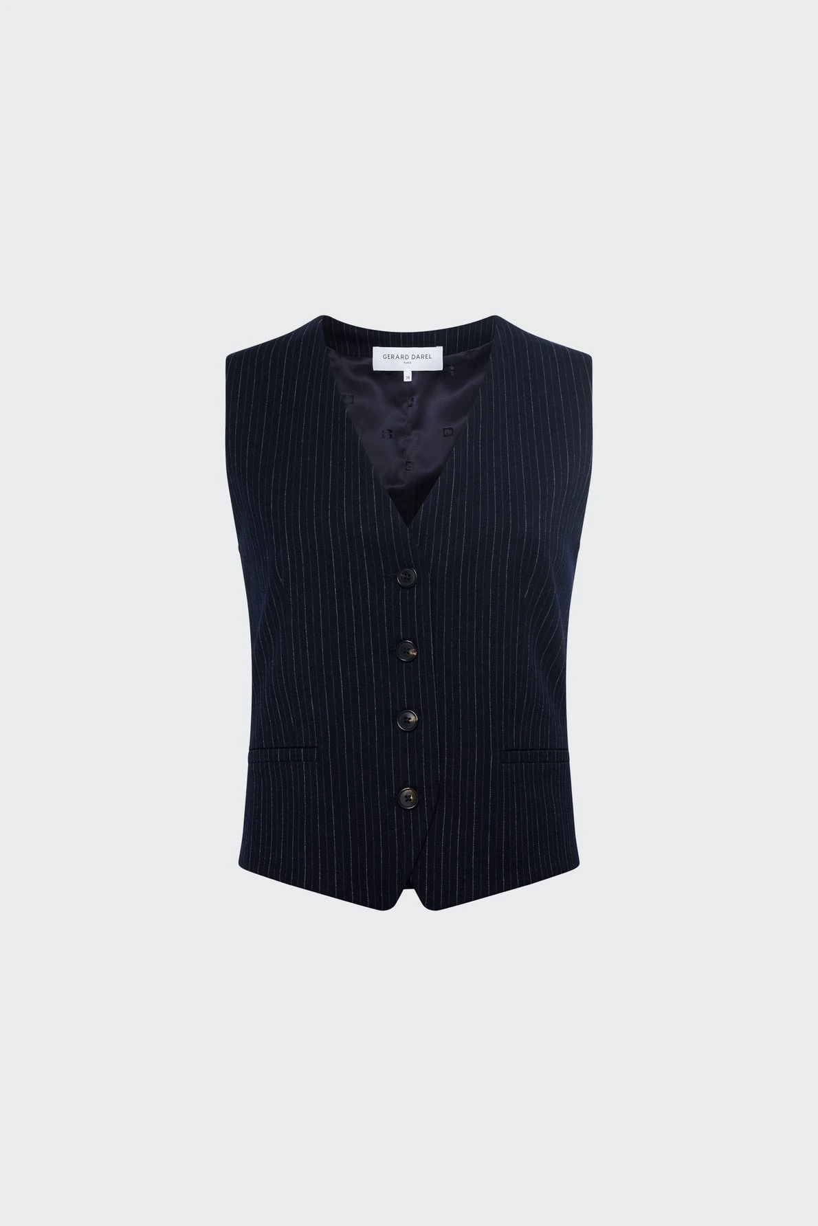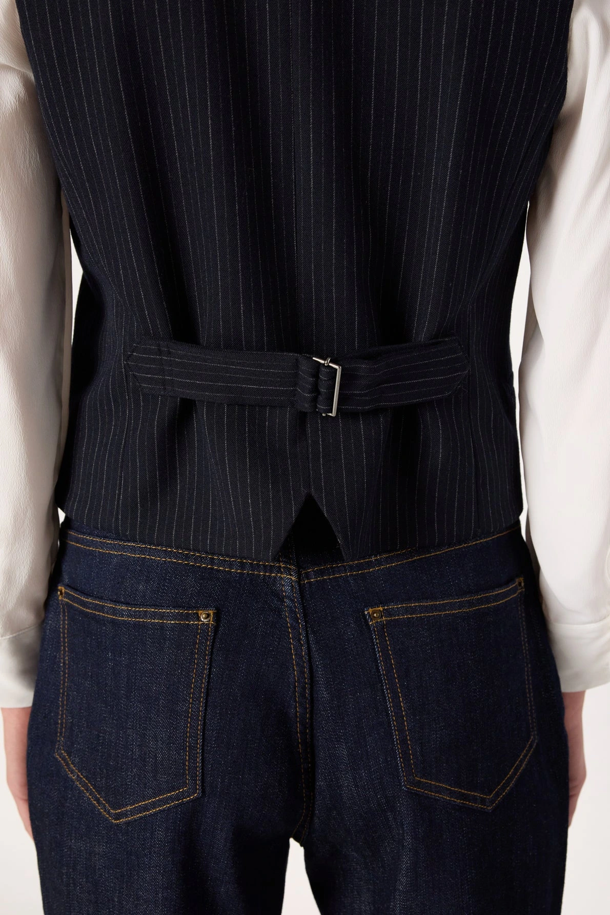 Gilet de tailleur sans manche bleu marine à fines rayures blanches. Il sublimera un look casual jean et un tee-shirt. A porter avec la veste et le pantalon coordonnés dans un esprit très chic.