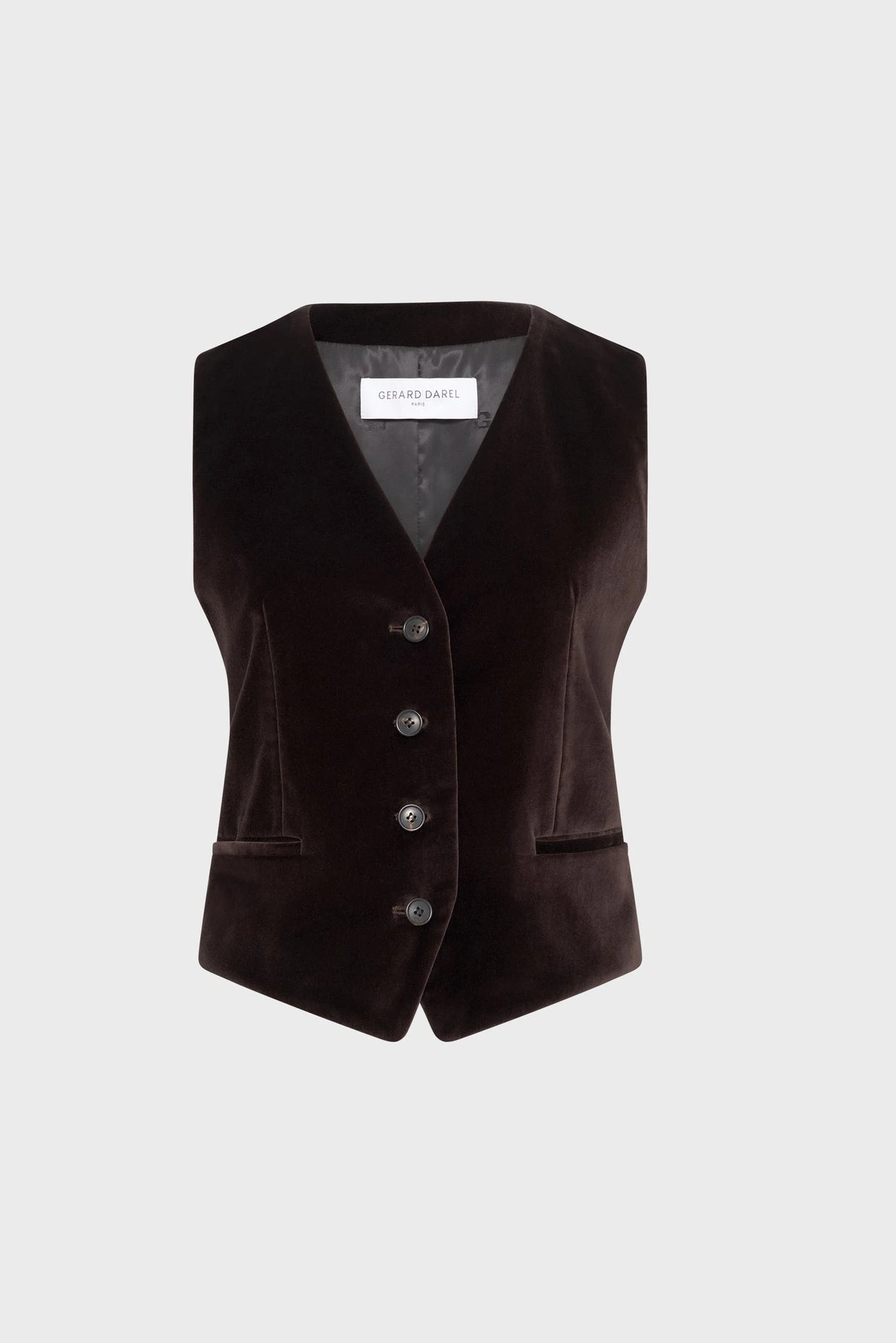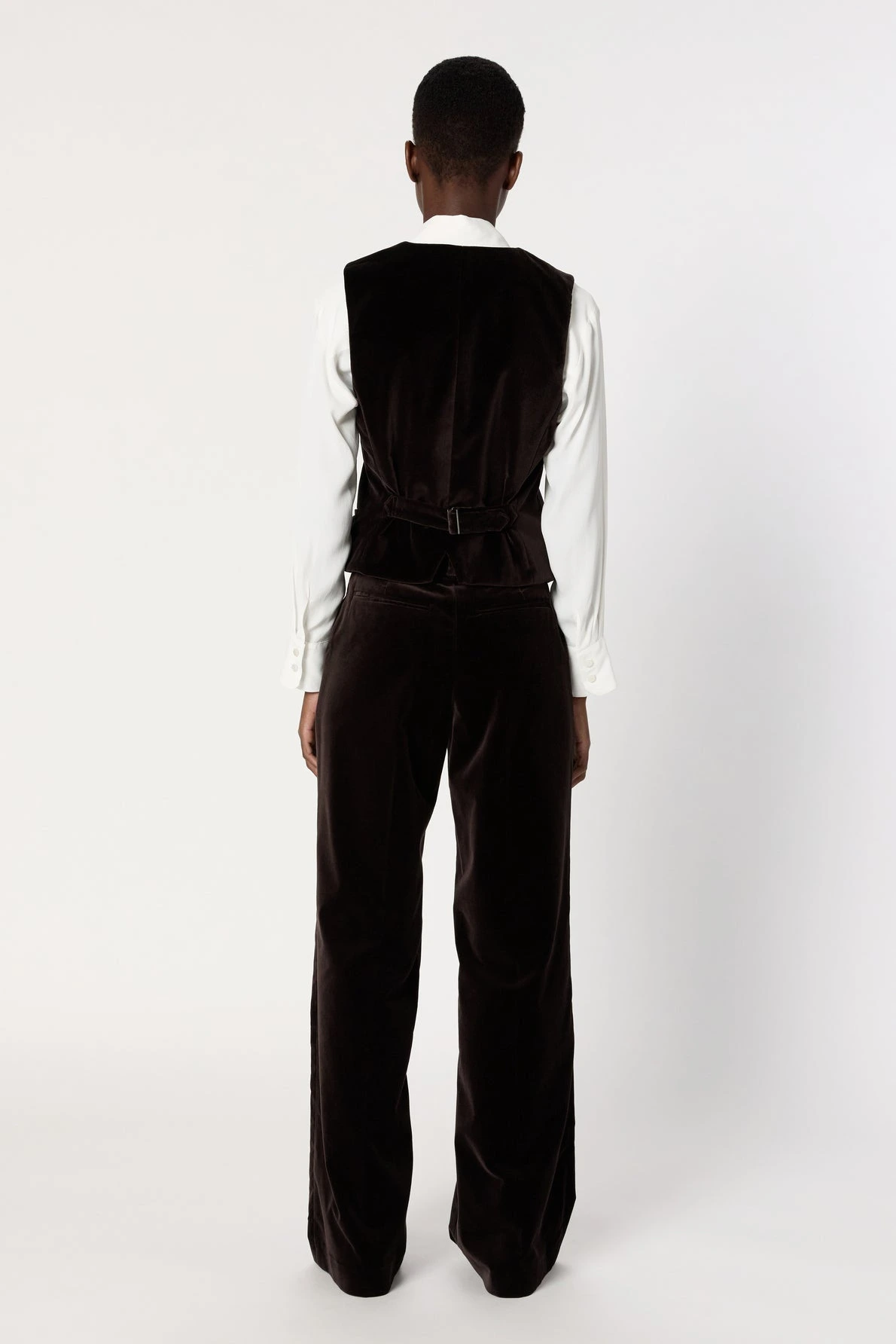 Le gilet de tailleur sans manche, pièce inspirée du vestiaire masculin, est décliné en velours ras marron. Porté avec une chemise blanche et le pantalon assorti, il donnera à la tenue une allure chic et délicieusement vintage.