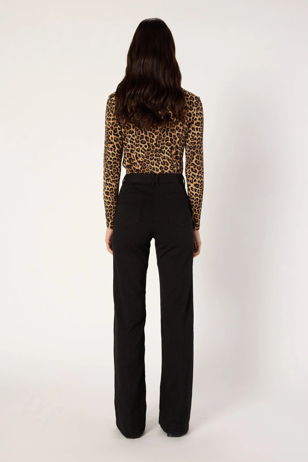 Le jean flare Anna, modèle iconique de la maison Darel, est décliné en noir dans un esprit chic et sophistiqué.