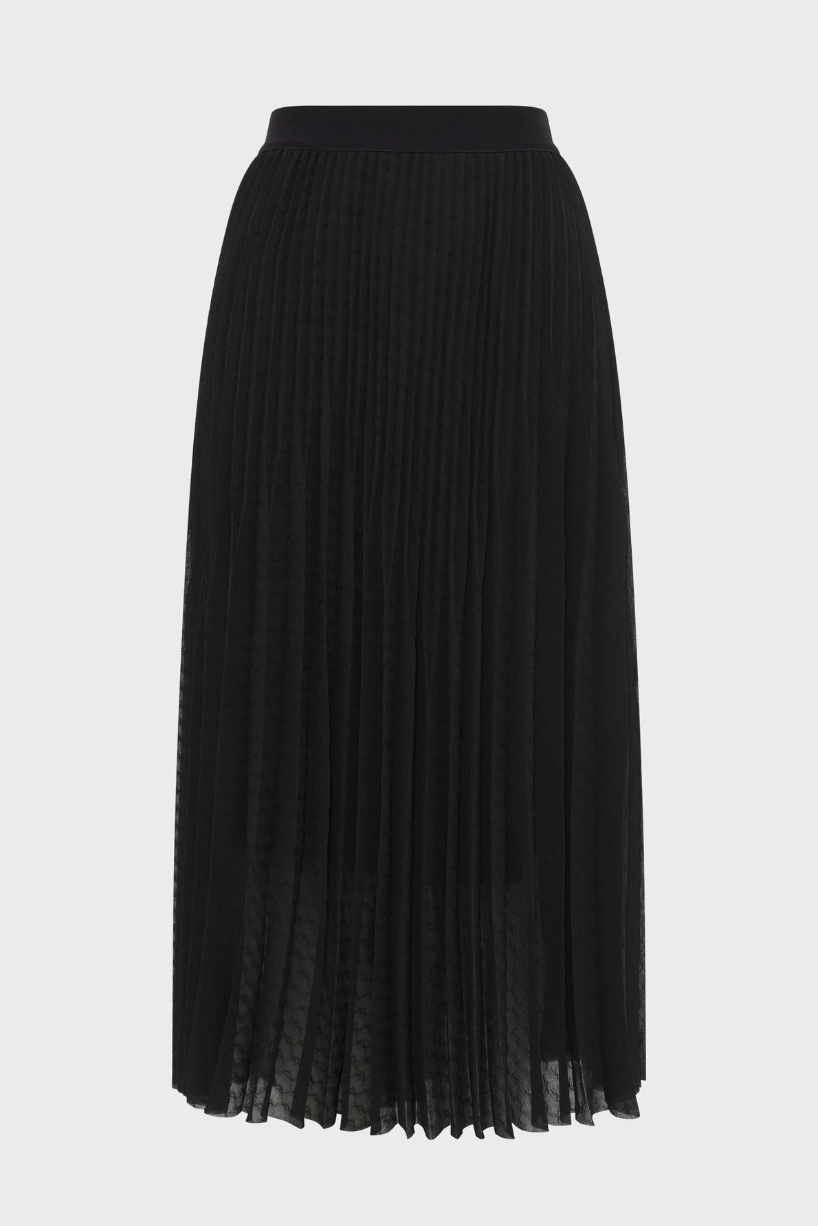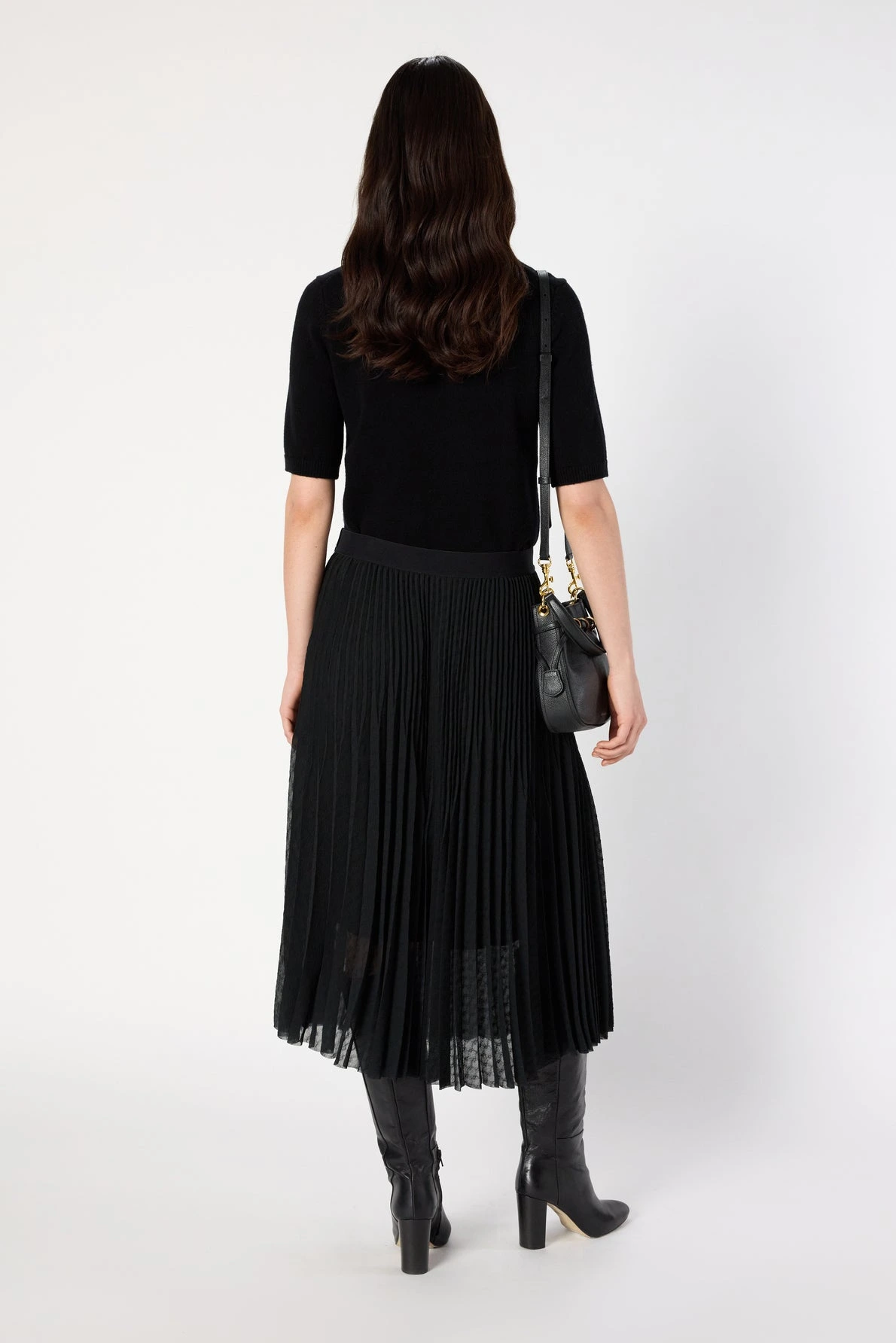 Inspirée de la jupe plissée, pièce atemporelle, ce modèle se distingue par son motif en jacquard et sa juxtaposition de matières pour un subtil jeu de transparence. Elle est confectionnée dans une mousseline noire aérienne, offrant une silhouette féminine et raffinée.