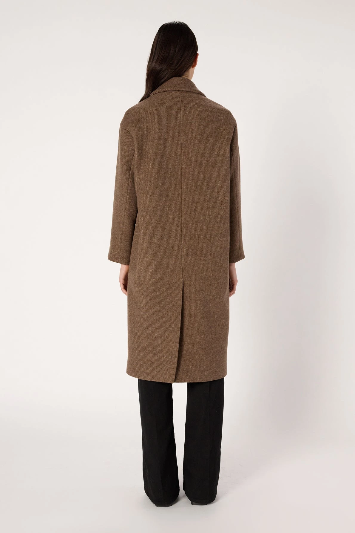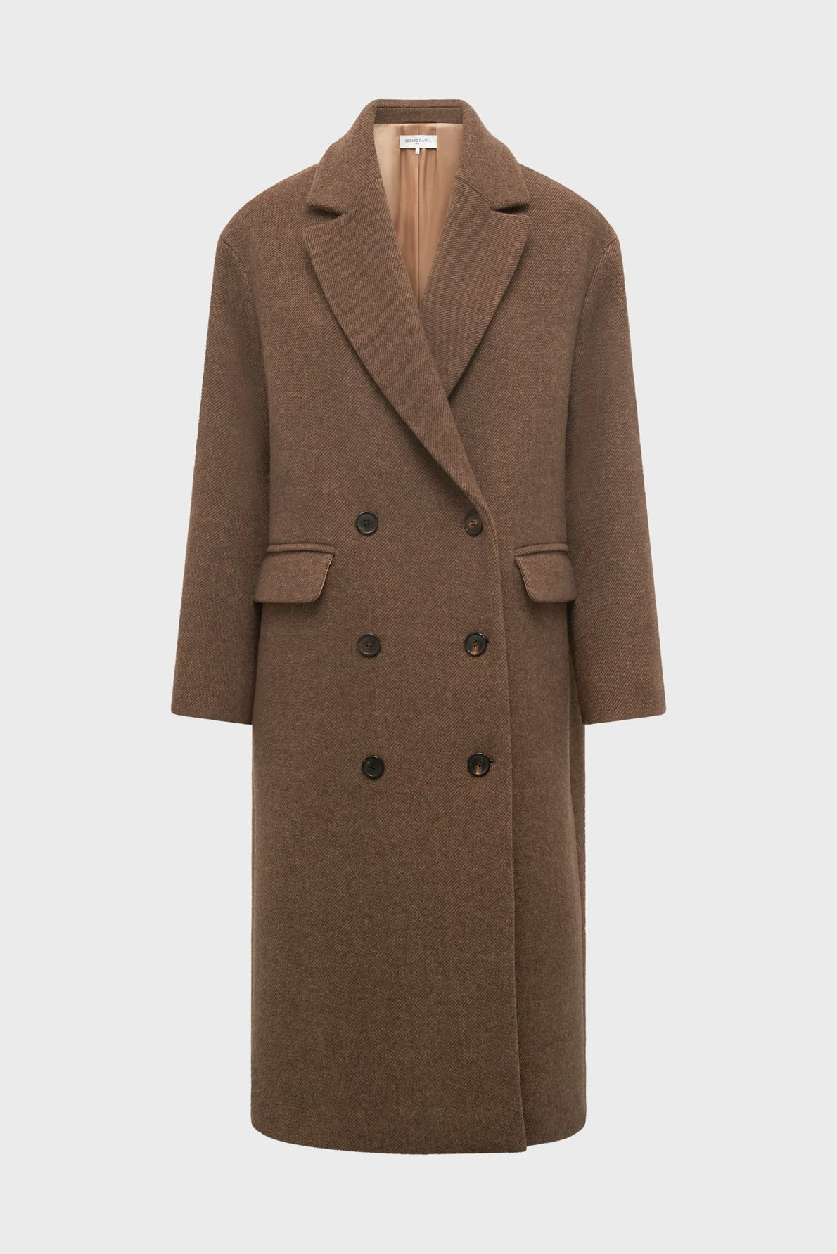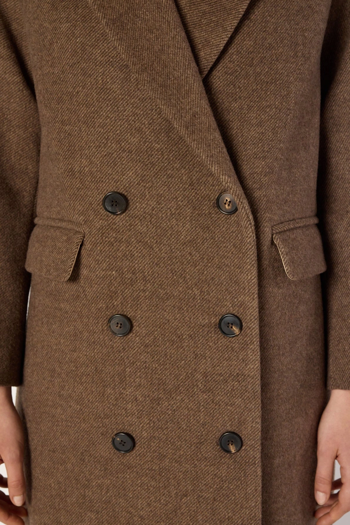 Allure chic et atemporelle pour ce manteau croisé en laine sergée mi-long et à la stature arrondie. Il est confectionné en laine mélangée sergée dans un coloris marron taupé.