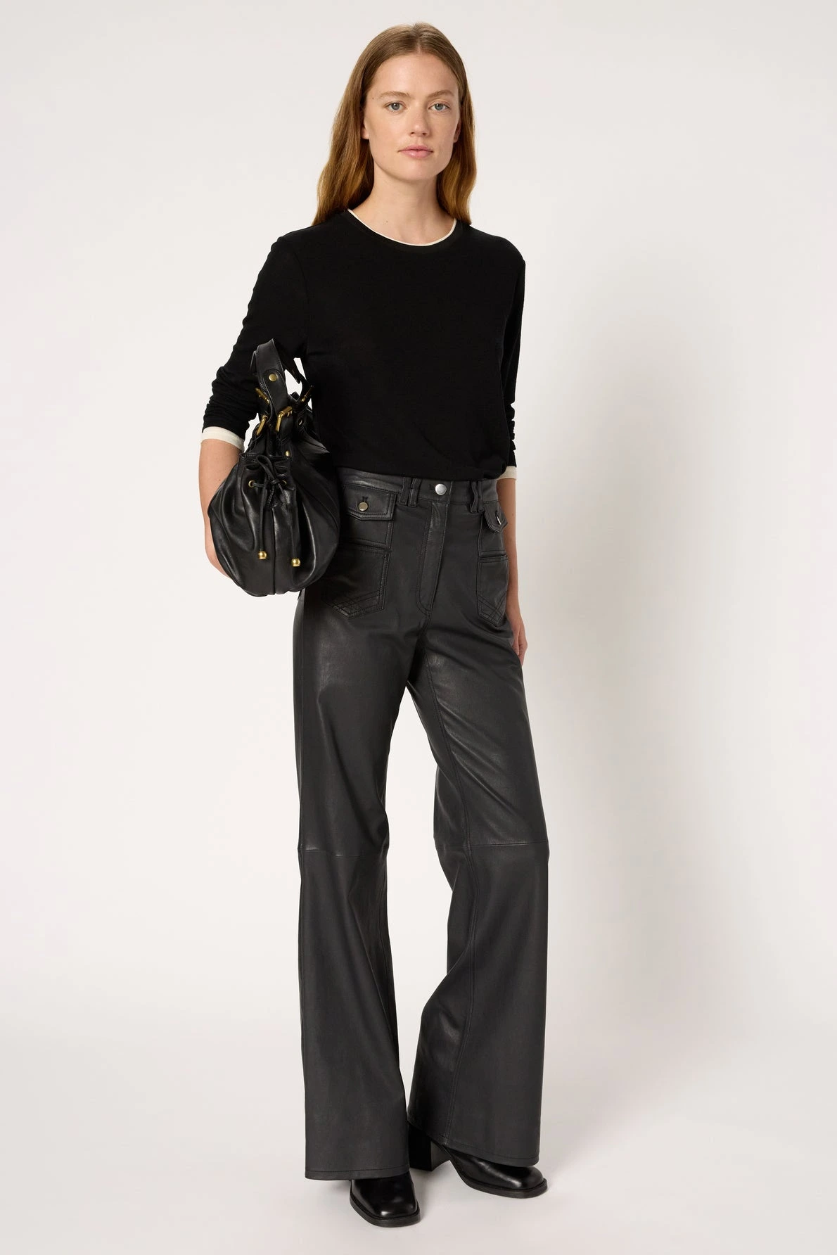 Le cuir se réinvente avec ce pantalon flare en cuir inspiré du jean ANNA. Une pièce à la fois chic et rock qui se portera aussi bien avec des baskets qu’une paire de bottines. 100% cuir.