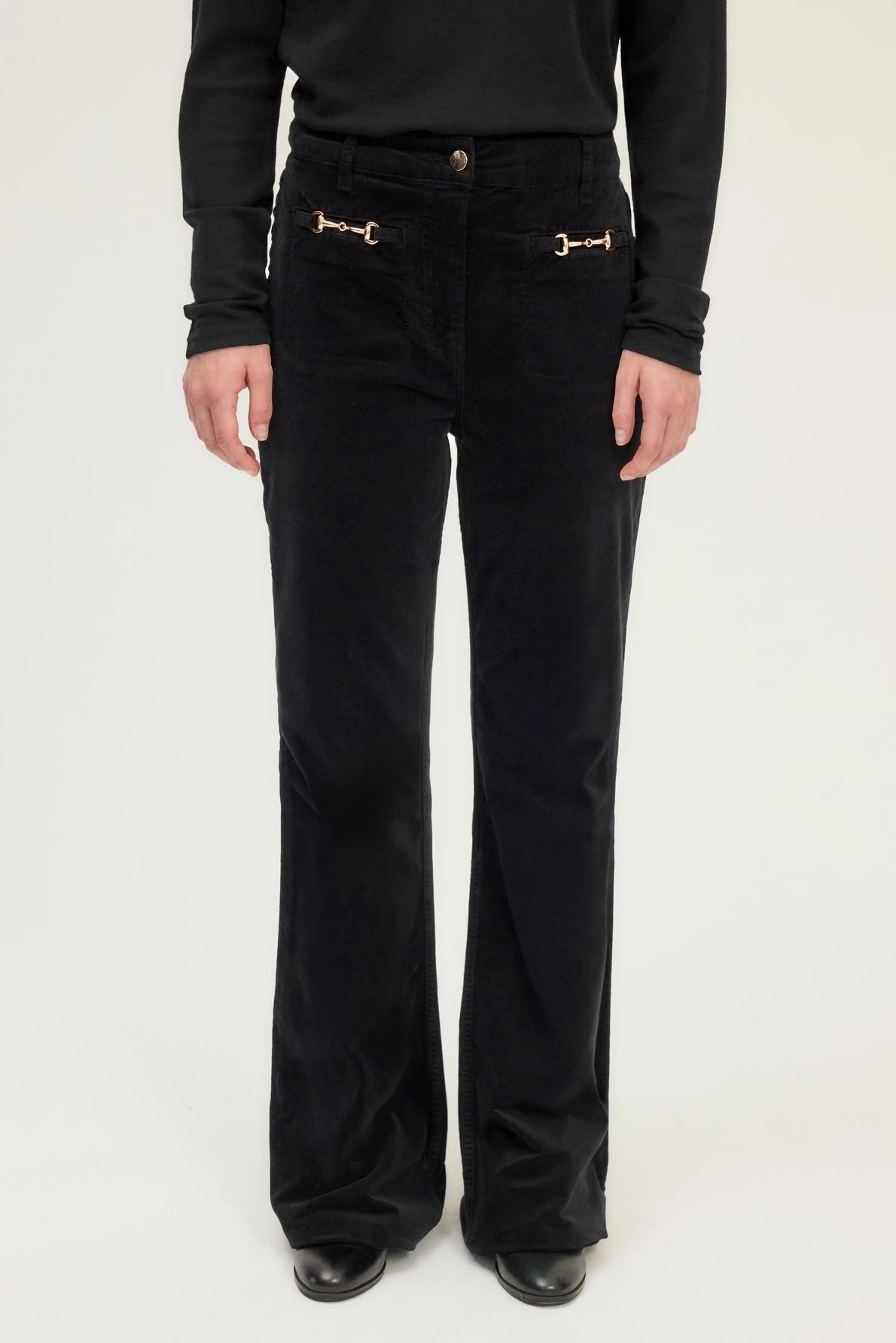 Avec ses poches ornées de mors dorés et sa coupe flare qui allonge la silhouette, ce pantalon flare en velours noir offre une allure à la fois vintage et sophistiquée.