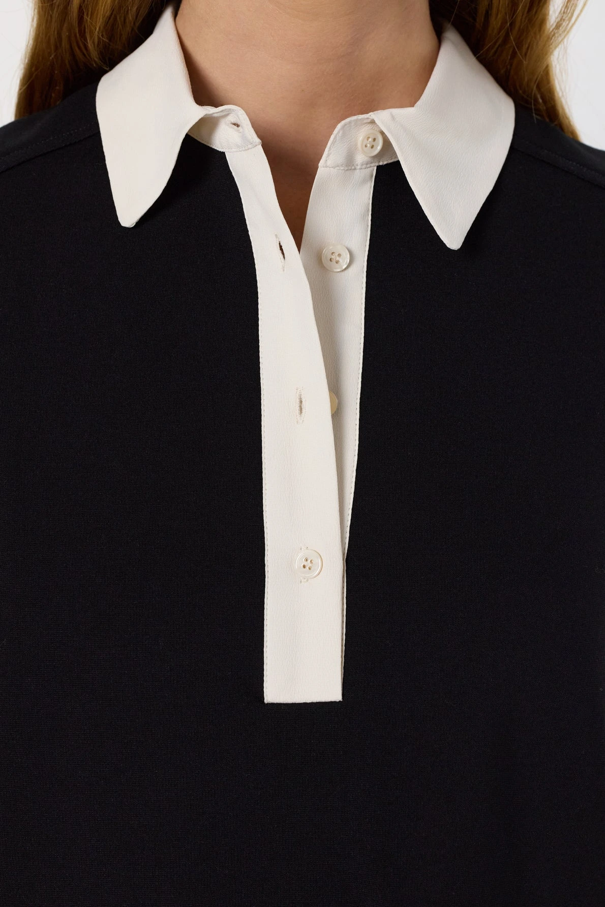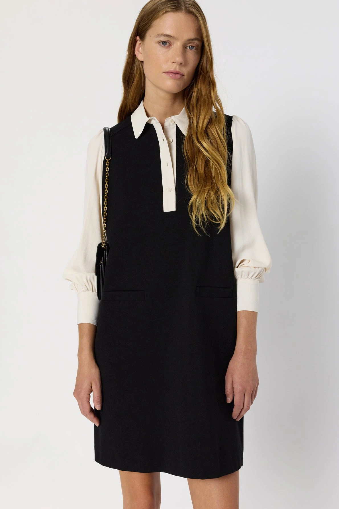 Esprit preppy chic pour cette robe bicolore noire et écrue au col chemise et à l’encolure ornée de boutons. Le corps est confectionné dans un microfibre épais avec de la tenue, les manches et le col sont en crêpe léger et vaporeux