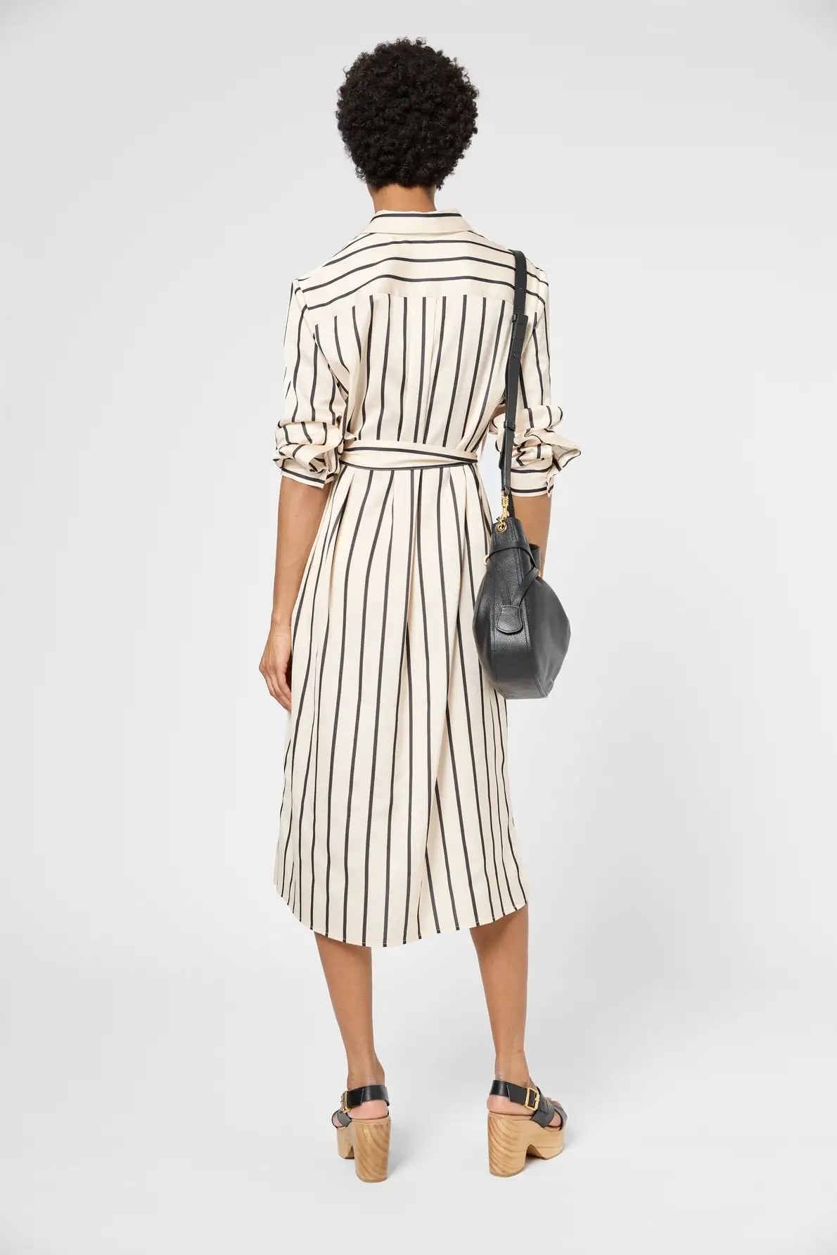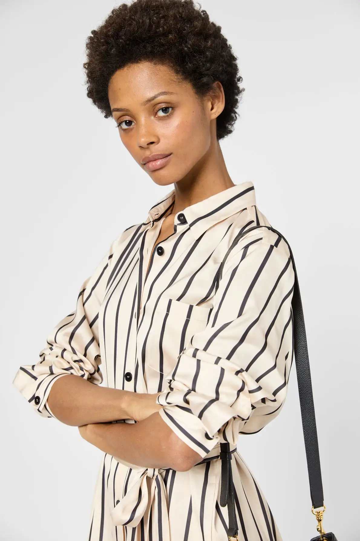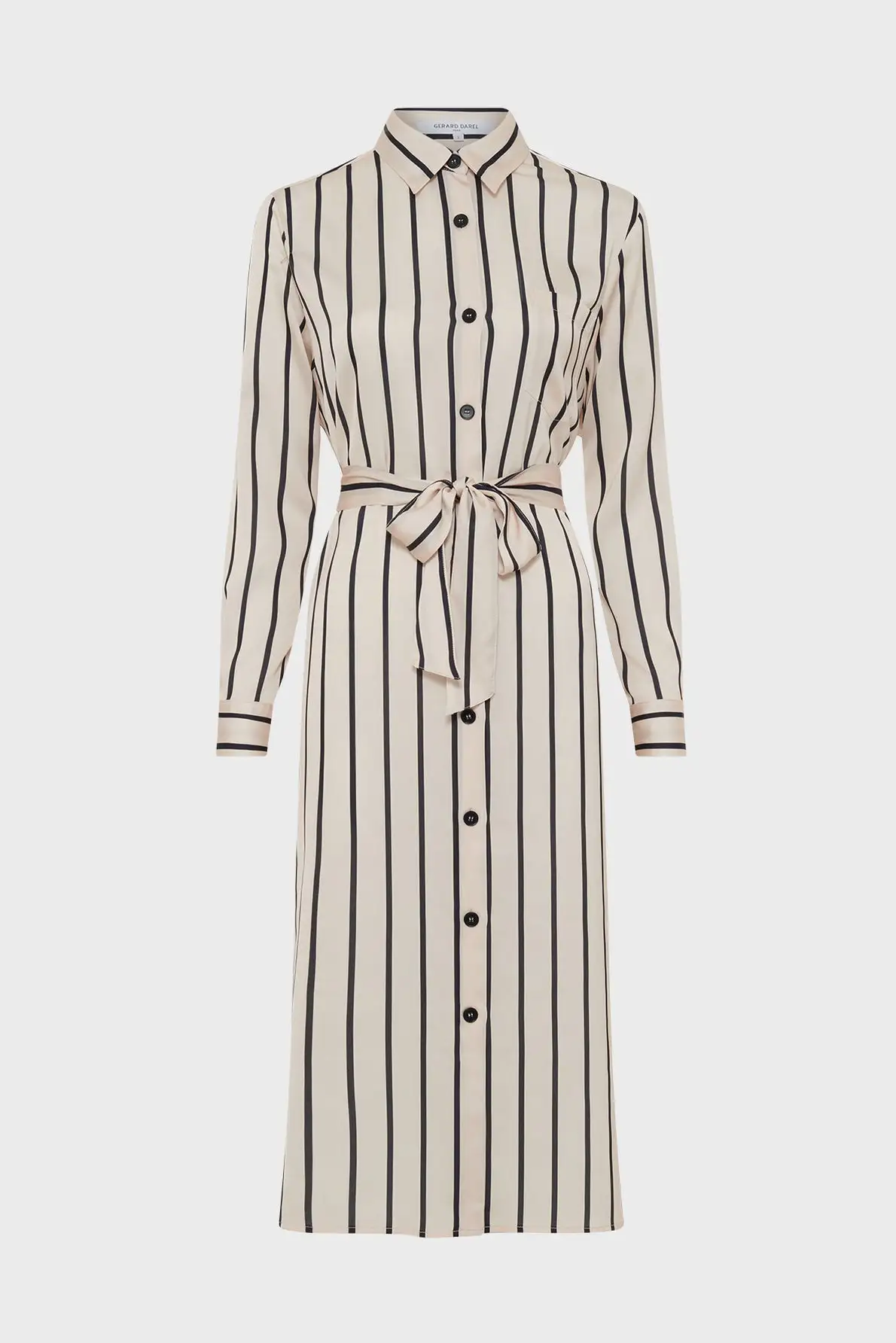 Robe chemise à rayures contrastées dans une matière satinée. A porter casual avec la ceinture assortie ou avec une ceinture en cuir pour un look plus sophistiqué.