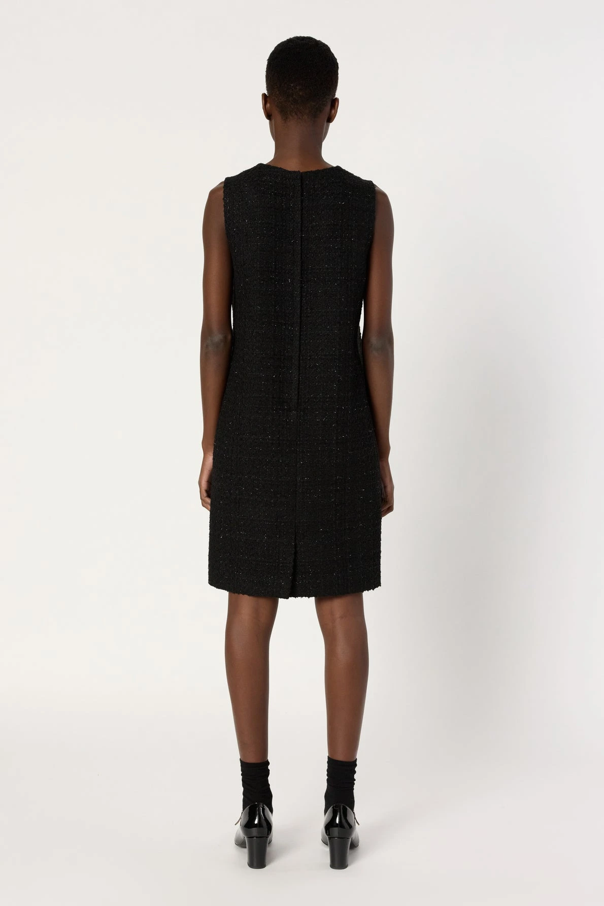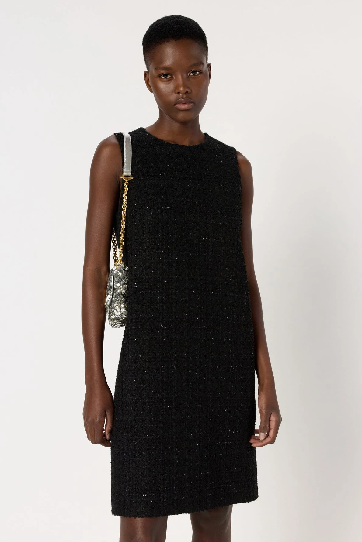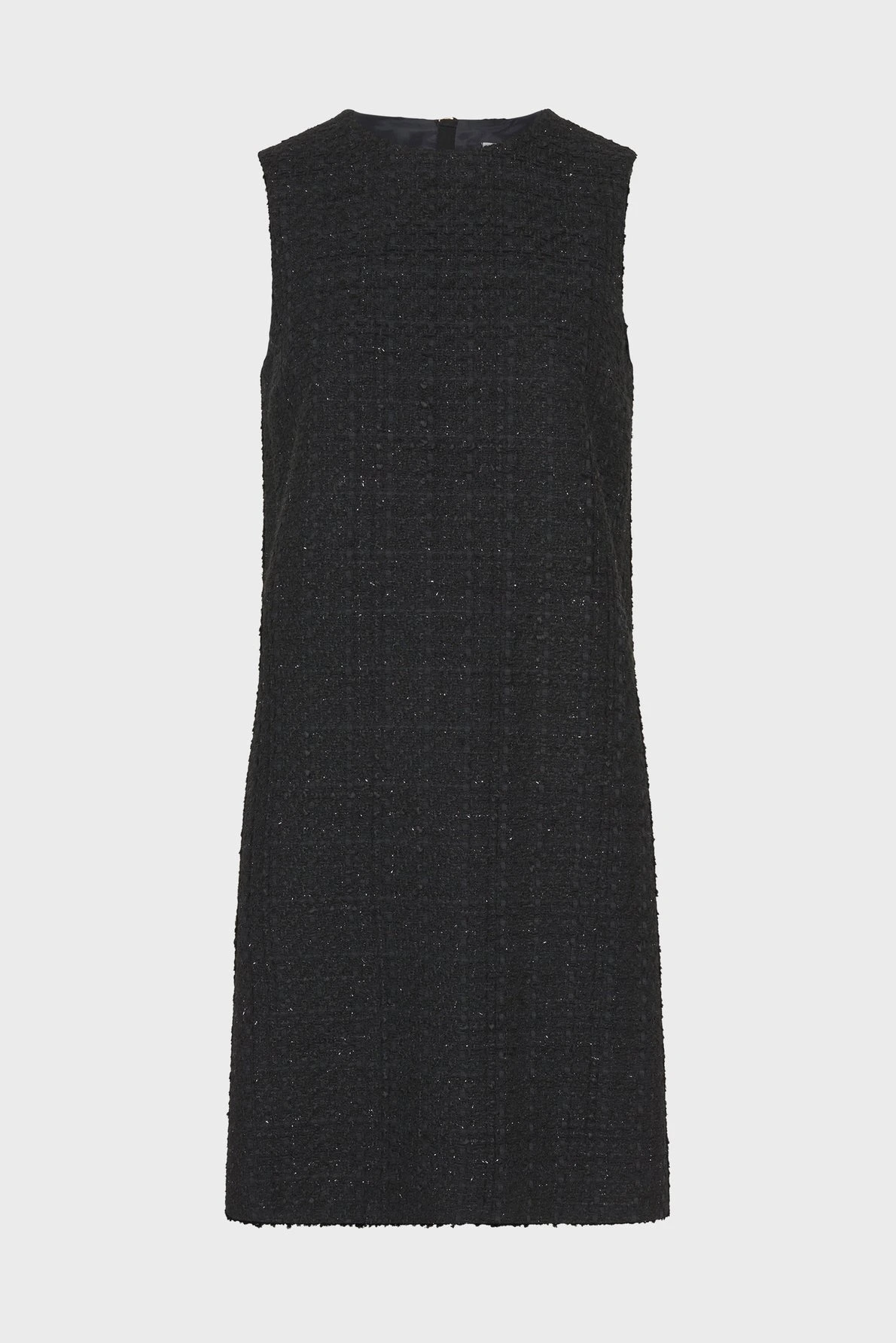 Esprit chic et intemporel pour cette robe sans manche en tweed et lurex noire. Discret, le lurex apporte une touche de fantaisie.