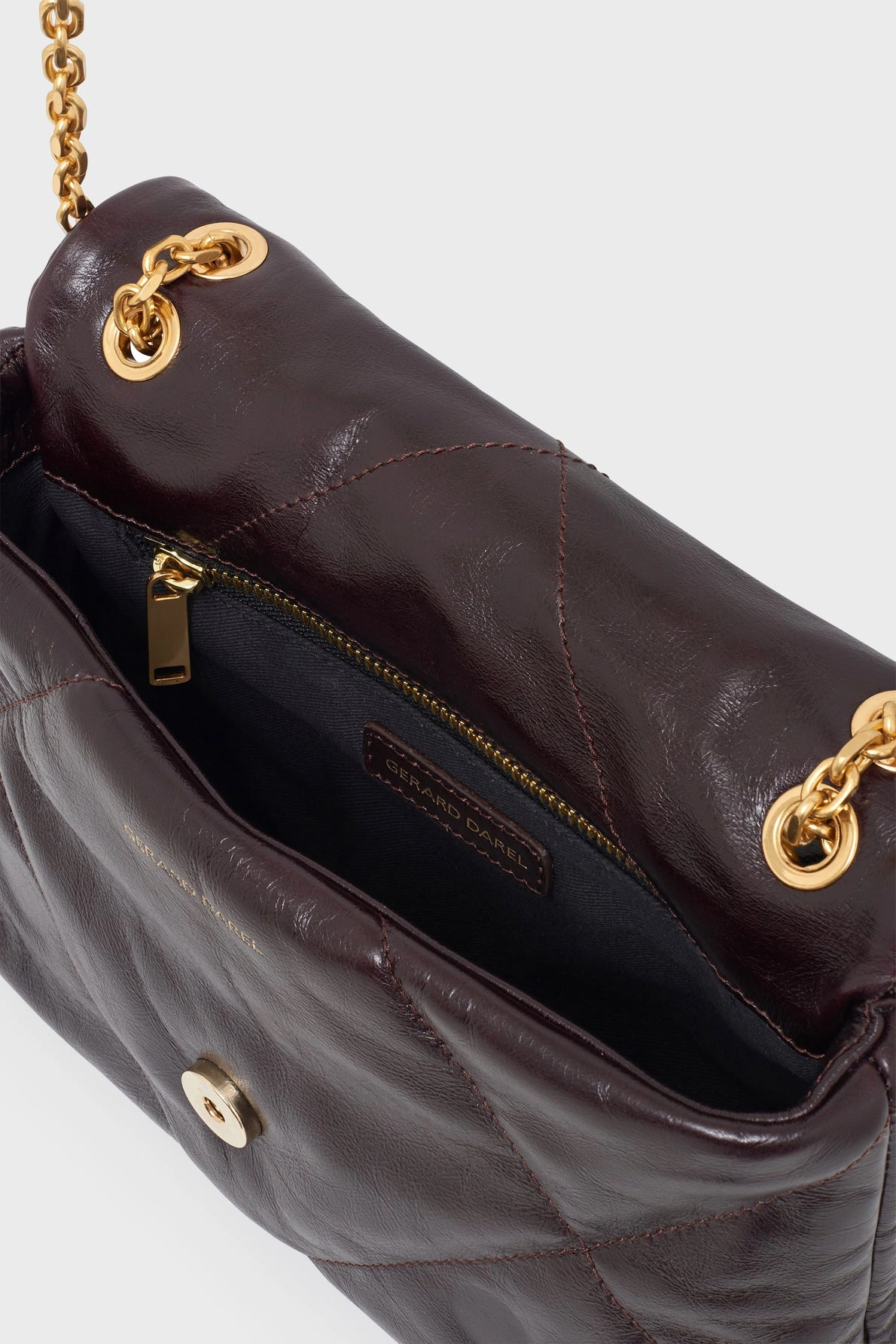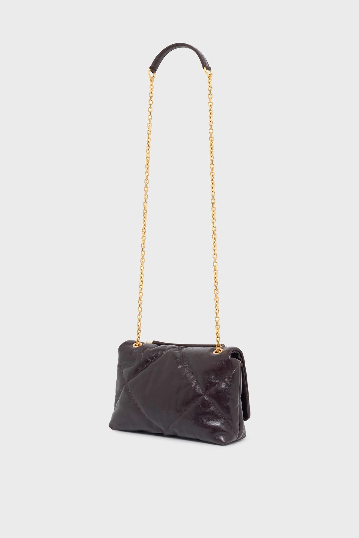 C’est en or sur le fermoir de son matelassage en cuir subtilement froissé d’inspiration 70’s, aux reflets de nuits parisiennes, que brillent ses initiales sur fond de losanges géants aux lignes graphiques et sensuelles.