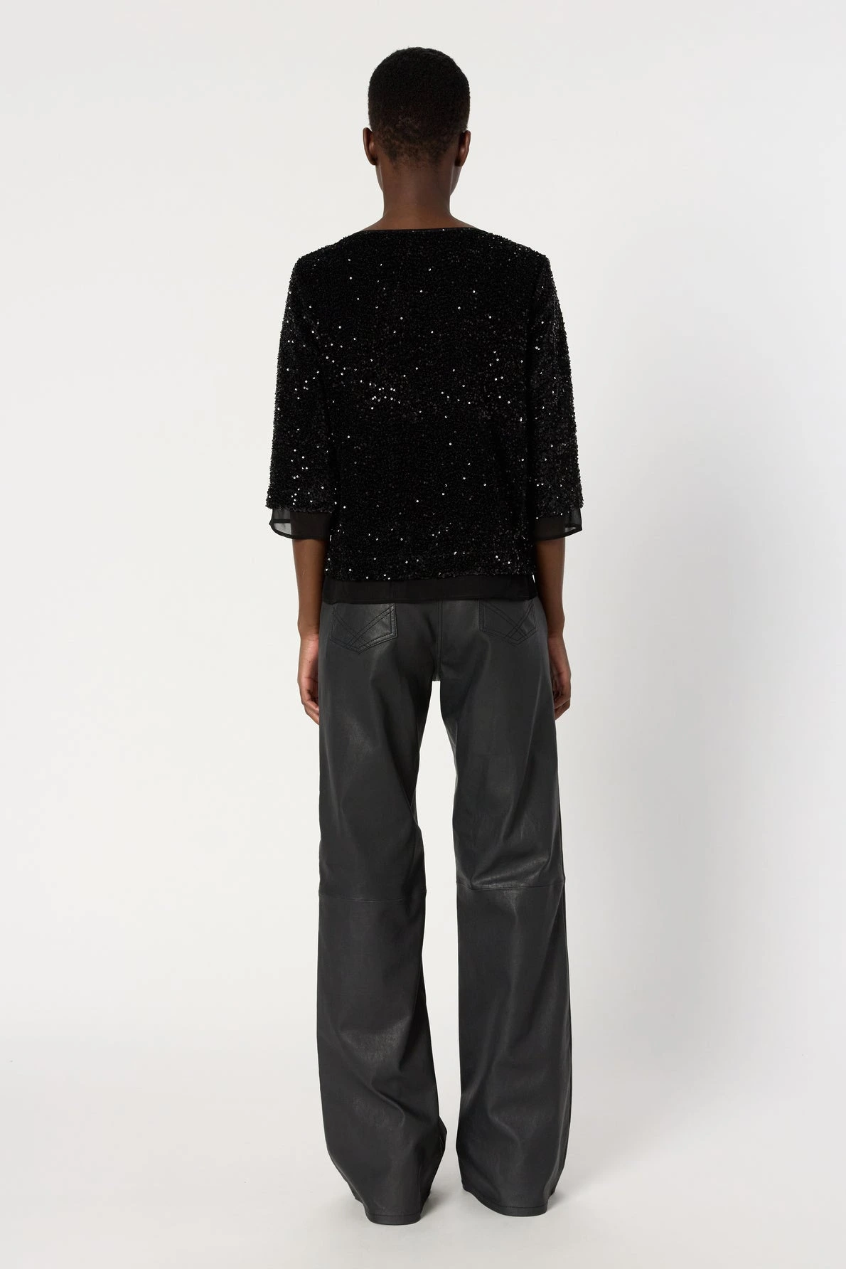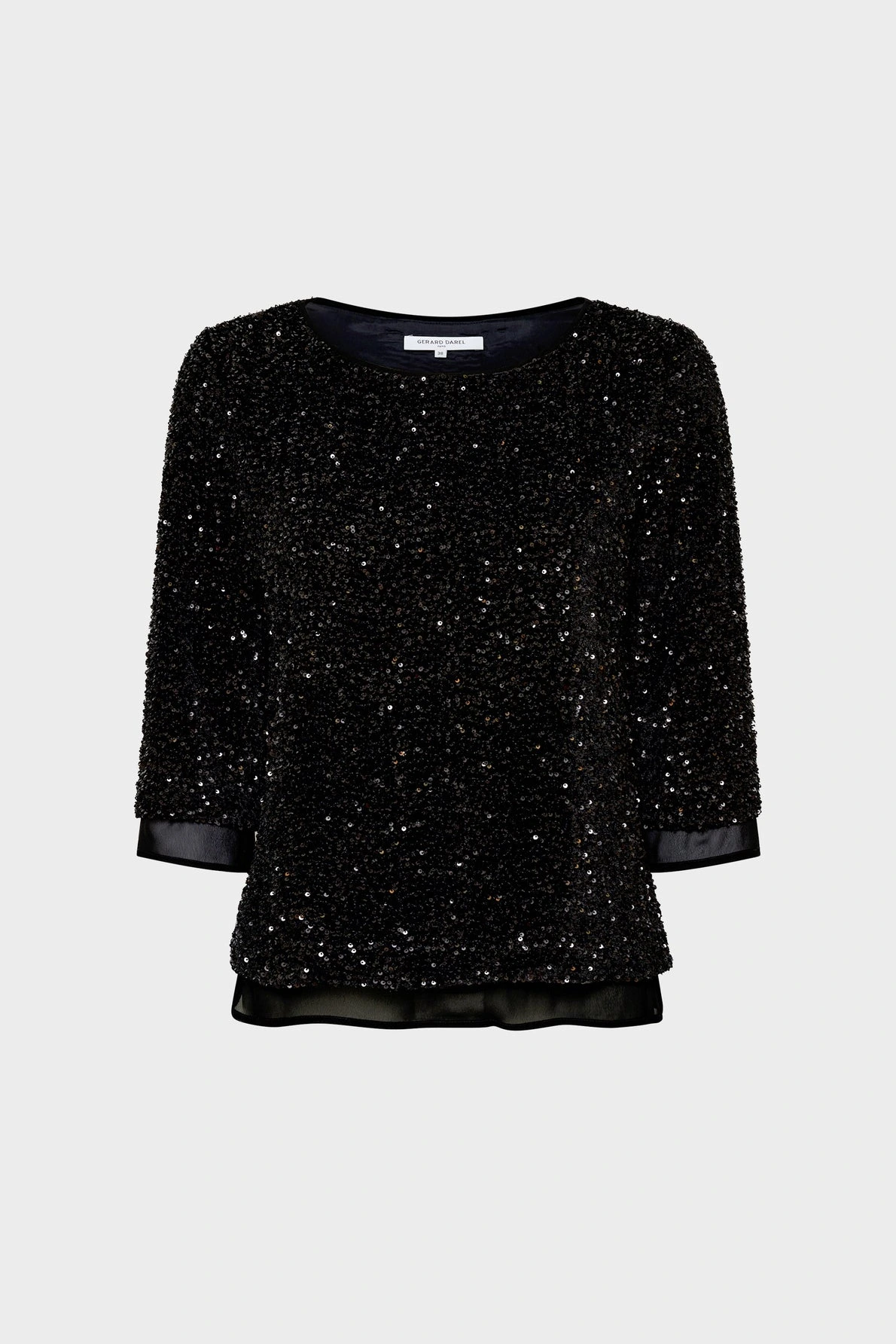 Créé dans un esprit sophistiqué, ce top de soirée se distingue par ses sequins noirs et ses finitions en voile aux manches et dans le bas de la pièce. A porter en soirée ou pour les occasions spéciales.