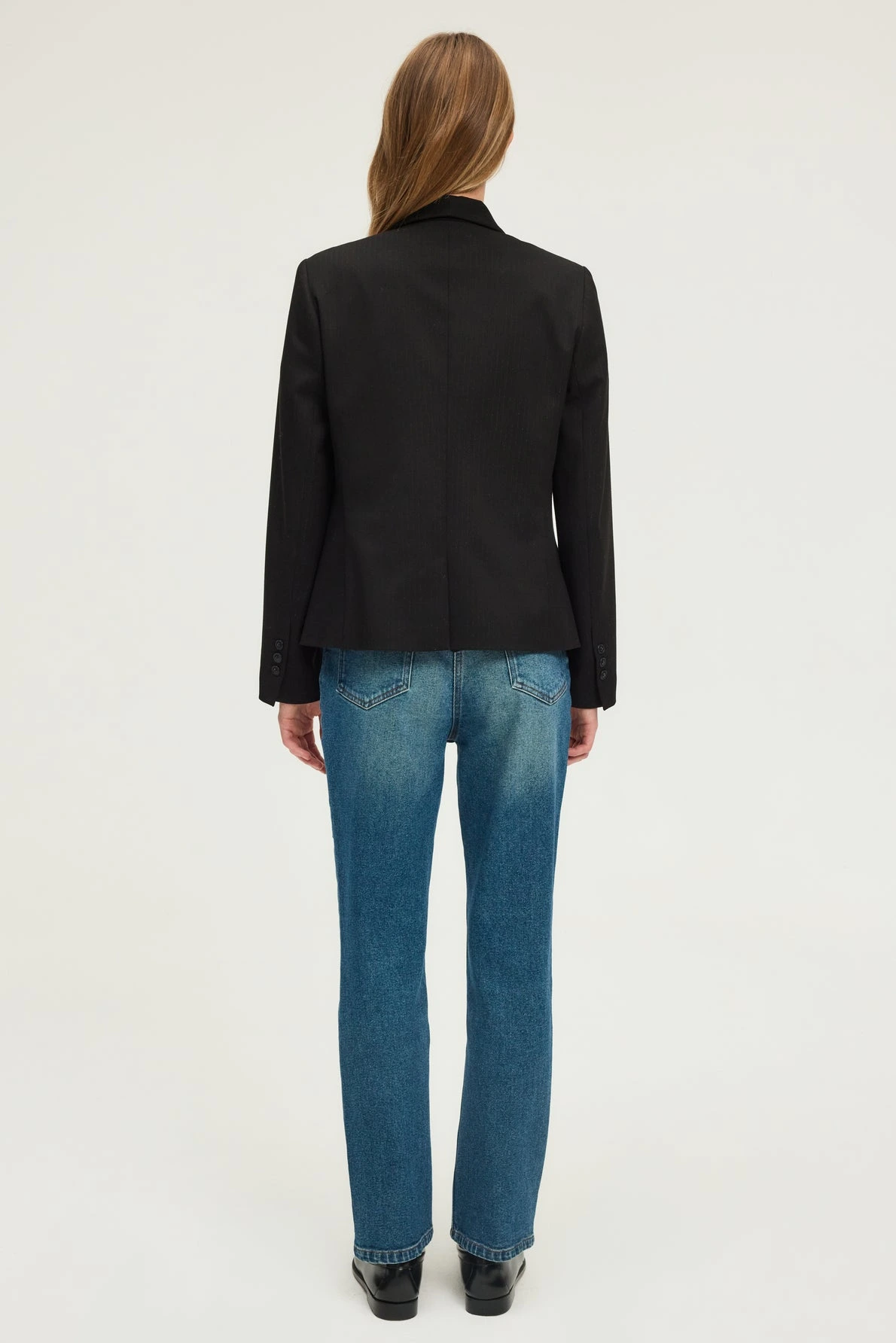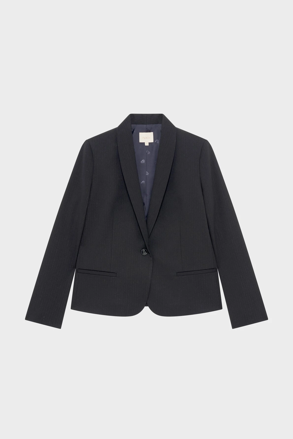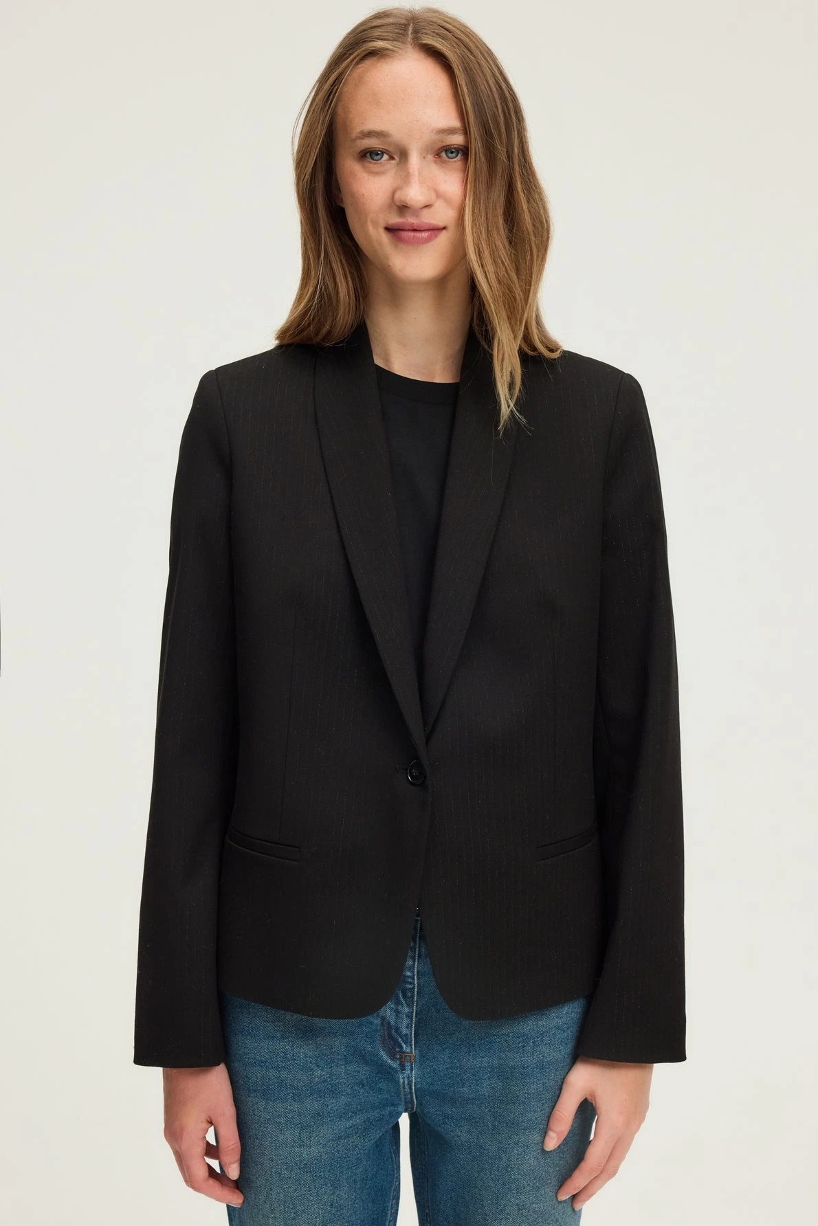 Veste de tailleur noire ornée de fines rayures en lurex argenté. Elle peut se porter avec le pantalon assorti pour un look bureau chic et contemporain, ou avec un jean dans un esprit plus casual.