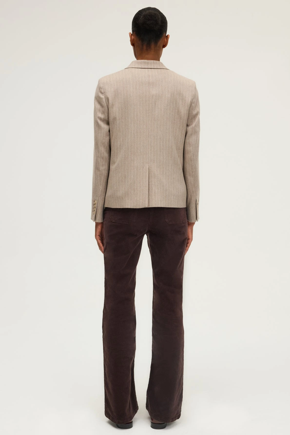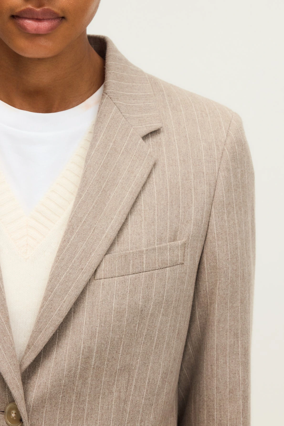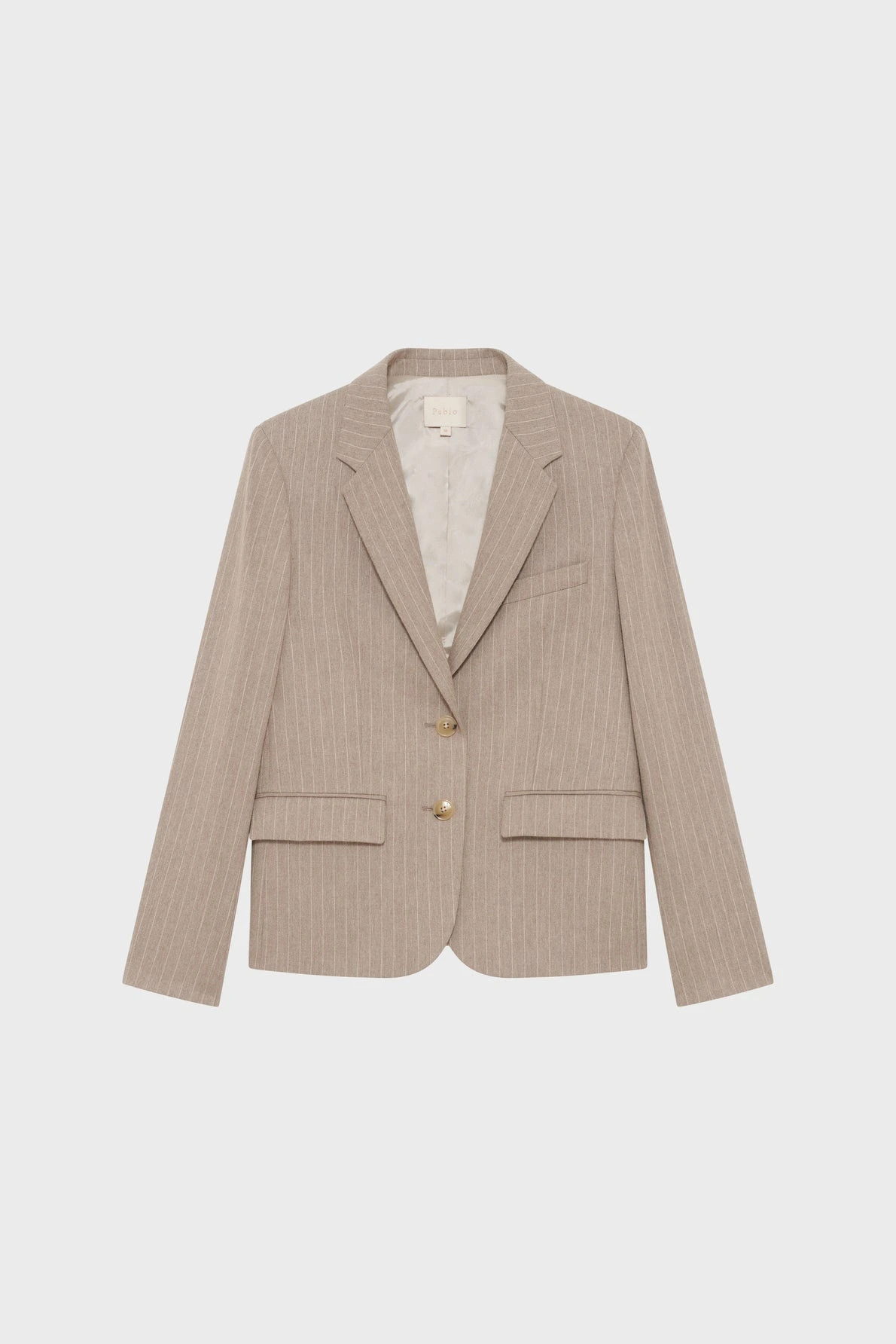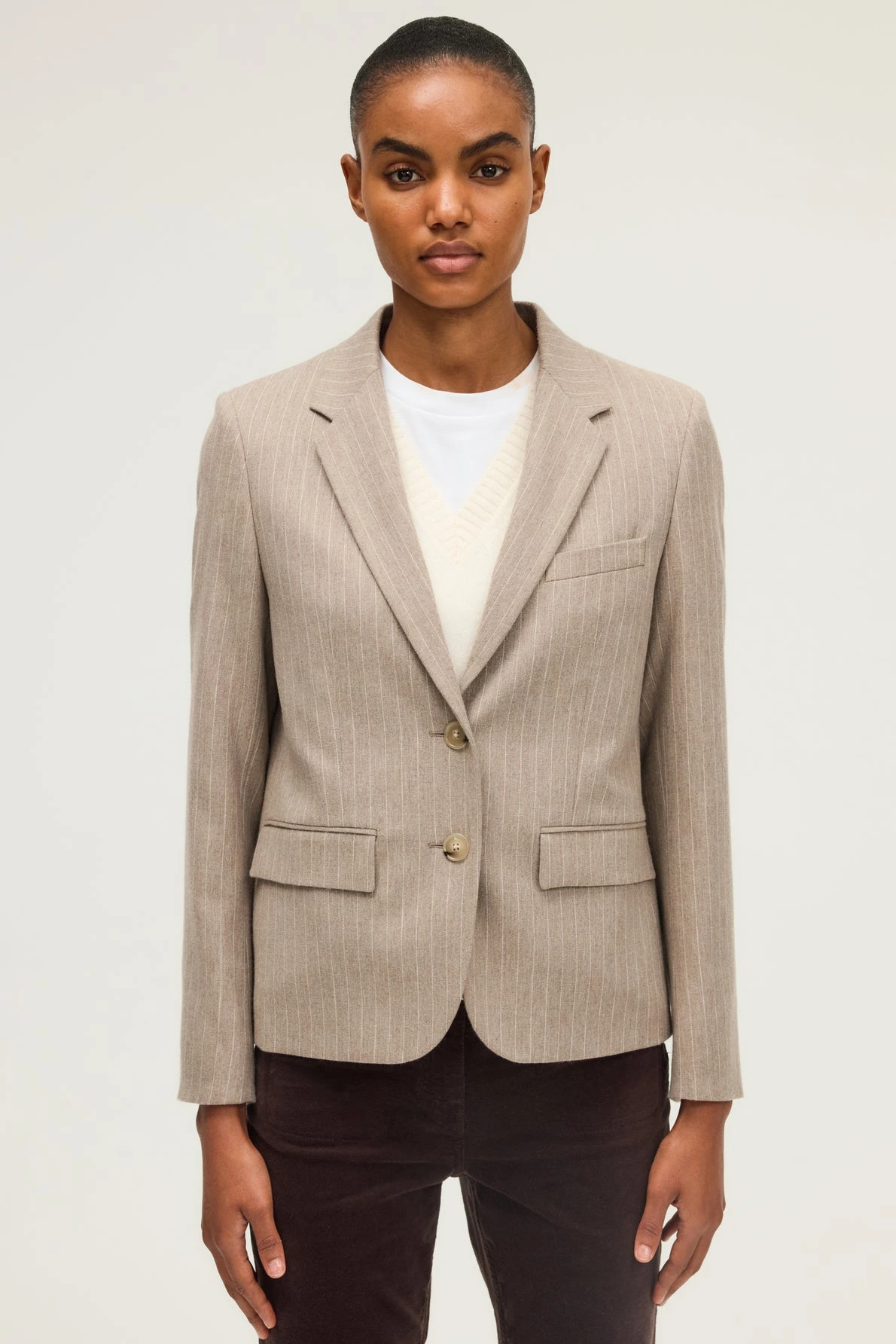 Veste de tailleur à rayures tennis déclinée dans des tons de sable, idéale pour l’entrée de saison. A porter avec le pantalon assorti ou dépareillée pour un look chic et décontracté. Confectionnée dans un mélange contenant de la laine.